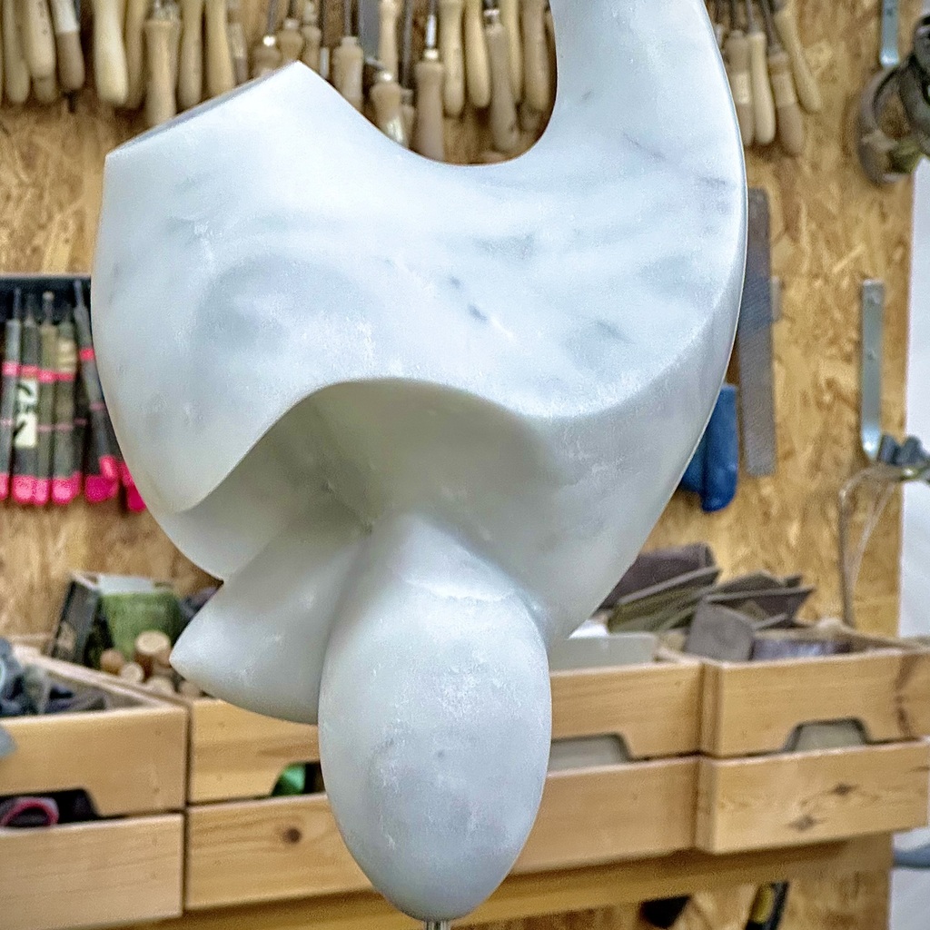 Magie ontstaat wanneer er vanuit het niets iets wordt gecreëerd: een beeld dat communiceert met zijn omgeving, licht en tijd. Steen dwingt mij om bedachtzamer en voorzichtiger te werk te gaan, in tegenstelling tot was en klei, waarin ik vrij kan schetsen en experimenteren. Het dwingt mij om rustiger te zijn en even te pauzeren voordat ik handel. Het haalt mij uit de tijd en maakt mij beschouwelijker, met een diep respect voor de oerkracht van de steen, die een soort eeuwigheid uitstraalt en de emotie lijkt te versterken.